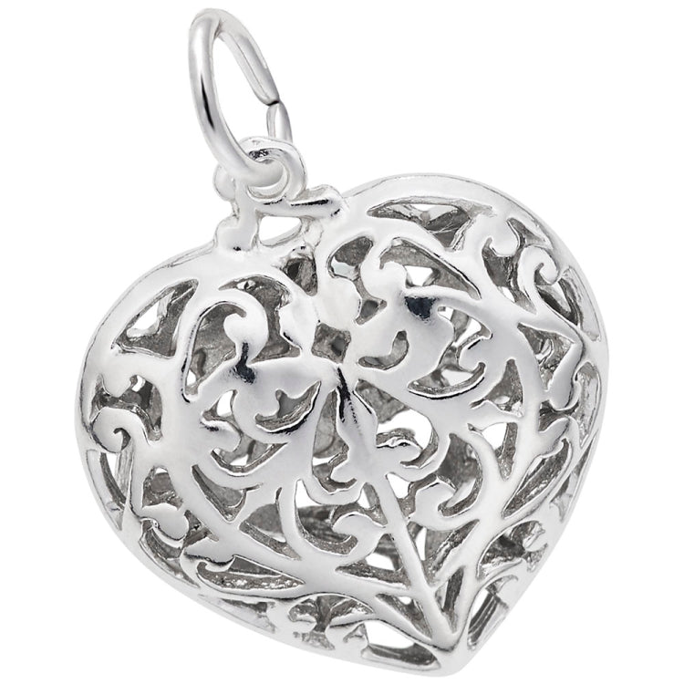 Love contains a delicate and intricate beauty. The Filigree Heart Charm demonstrates those qualities. This detailed jewelry piece is available in silver and gold.