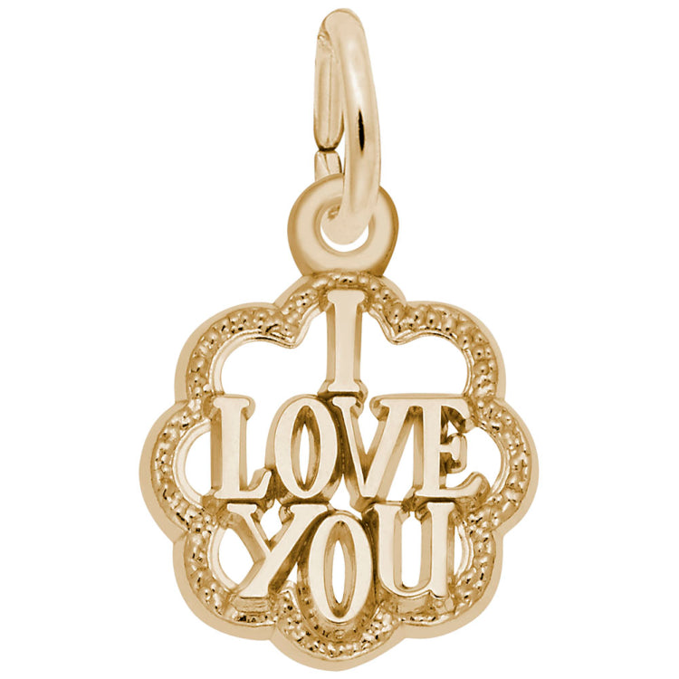 Express your true feelings with the I Love You With Scalloped Border Charm. Three little sentimental words say it all. Available in silver and gold.