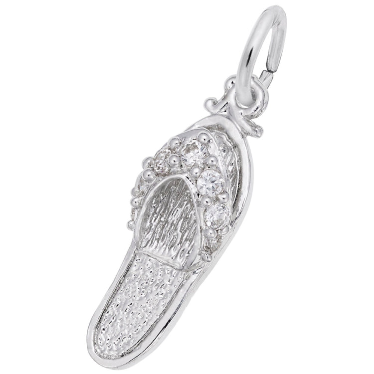 Keep warm beach memories with on a charm bracelet when wearing the Sandal With Stones Charm. This charm flip flops as it dangles. Available in silver and gold.