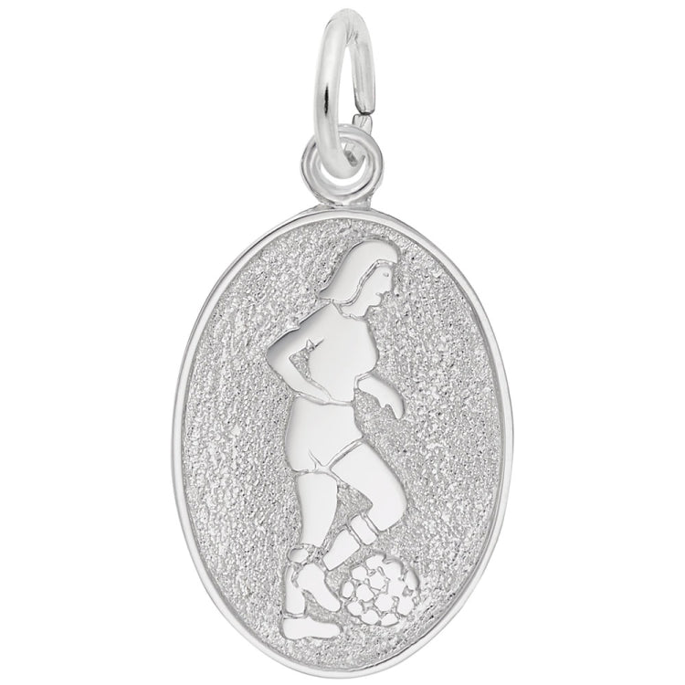 Kick it into the goal with the Soccer Player Oval Disc Charm. Personalize this charm with an engraved message on the back. Available in silver and gold.