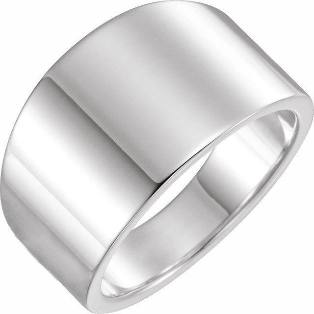 A plain polished silver ring that is 12mm wide at the widest and 8.75mm wide at the base.