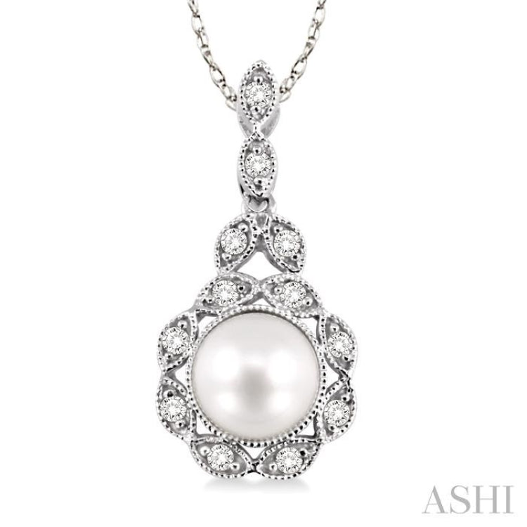 6.5 MM Cultured Pearl and 1/10 Ctw Single Cut Diamond Pendant in 14K White Gold with Chain