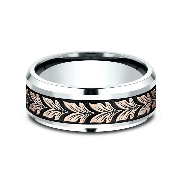 Leaf motif with wear resistant black detailing, polished drop bevel edges