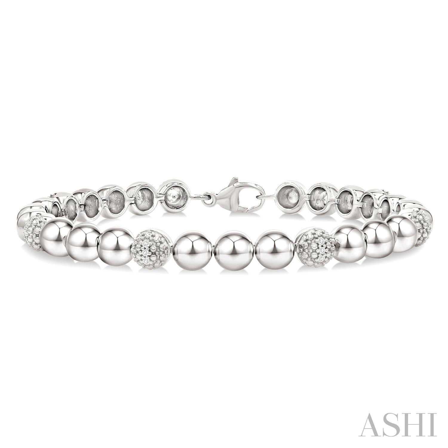 Adorn your wrist with an artful arrangement of simple shapes, as this lovely diamond fashion bracelet transforms minimal lines into a statement of purposeful elegance. A rhythmic sequence of three smooth silver beads gives way to a single bead encrusted with diamonds, in a repeated pattern along the entire length of the bracelet. A total of 21 pave set single cut diamonds embellish the diamond-adorned beads. A lobster-clasp closure ensures a secure and comfortable fit. The diamond fashion bracelet is designed in rhodium finish silver. Total diamond weight is 1/5 Ctw.