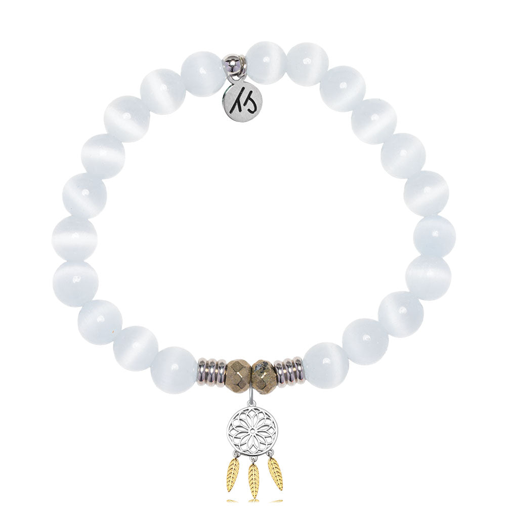 White Cats Eye Gemstone Bracelet with Dream Catcher Sterling Silver Charm