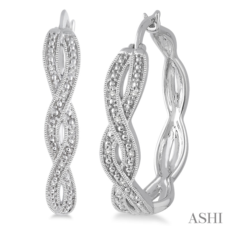These diamond hoop earrings are an ideal gift for the woman who loves to be in style. Fashioned in cool sterling silver, these classic earrings are embellished with a row of 18 sparkling round cut diamonds in prong setting. This pair of earrings will make her smiling always with the joy of your presence in her life. Total diamond weight is 1/10 ctw.