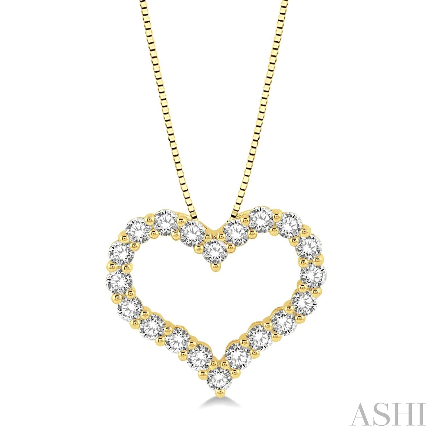 A charming diamond heart pendant, this one has great appeal. With just a heart-shaped border and hollow center, it offers a delicate look to the pendant. The heart pendant is embellished with 20 prong set round cut diamonds that line the top and provide a sparkling touch to the dainty heart charm. An Box chain comes included to carry the pendant. Both the Box chain and heart pendant are crafted in 14 karat yellow gold. Total diamond weight is 3/4 ctw.