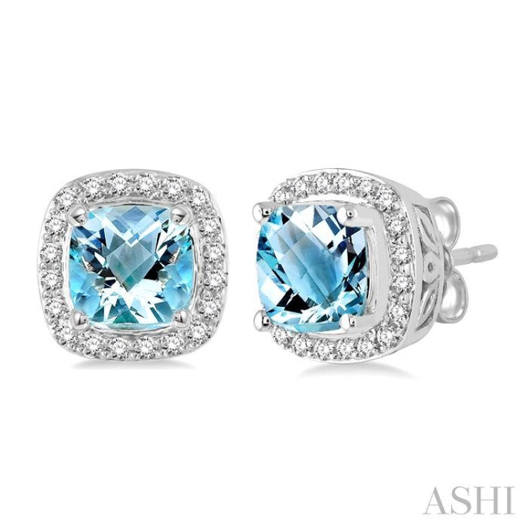 6x6 MM Cushion Shape Aquamarine and 1/4 Ctw Round Cut Diamond Earrings in 14K White Gold