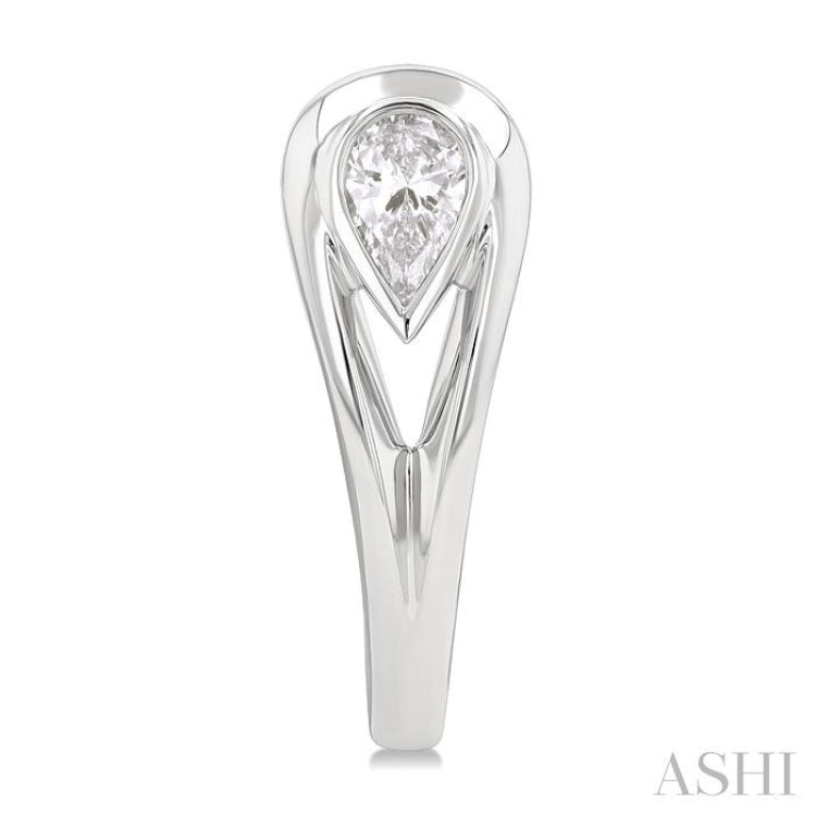 These diamond half hoop fashion earrings offer a refined twist on a classic silhouette. They deliver a distinctive sparkle that complements both casual and sophisticated looks. Each earring showcases an elongated pear-shaped front that draws the eye. The design features an open-window pear-shaped cutout at the top, where a bezel set 1/6 Ctw pear cut diamond fills the upper section with a subtle yet captivating brilliance. Secured with push-back earnut closures for a comfortable and reliable fit, the earrings combine style with everyday wearability. The fashion half hoop earrings are styled in a polished rhodium finish 14 karat white gold. Total diamond weight is 1/3 Ctw.