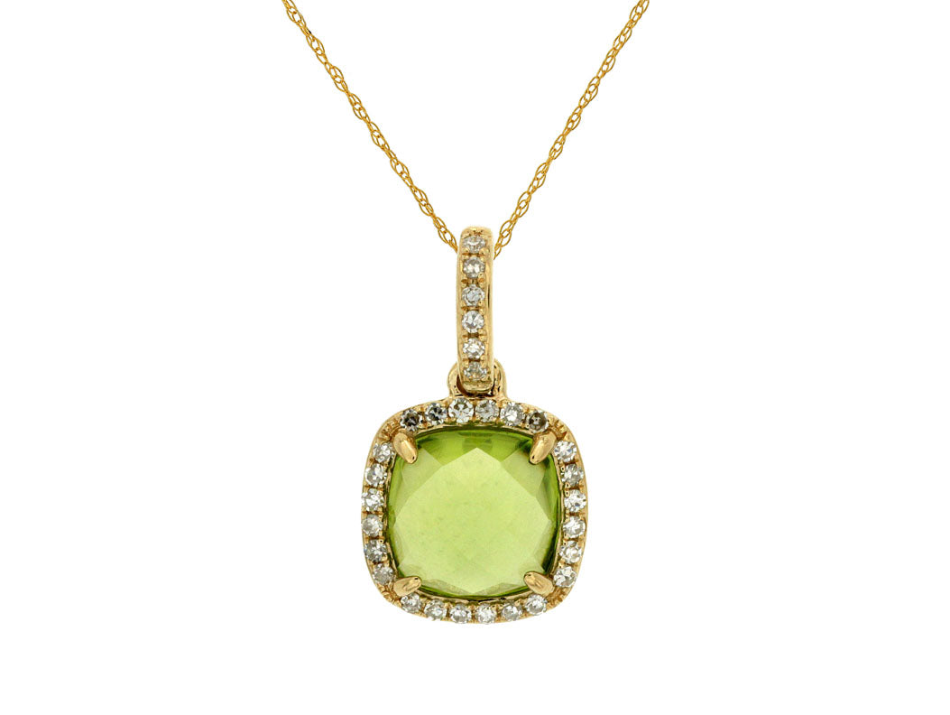 This elegant pendant features a stunning 1.75-carat cushion-cut peridot centerpiece, known for its vibrant lime-green hue. The peridot is beautifully framed by a sparkling halo of round-cut diamonds, which also adorn the pendant's bail. Set in rich 14-karat yellow gold, the diamonds have a total weight of 0.12 carats, adding a brilliant shimmer to this classic and sophisticated piece.