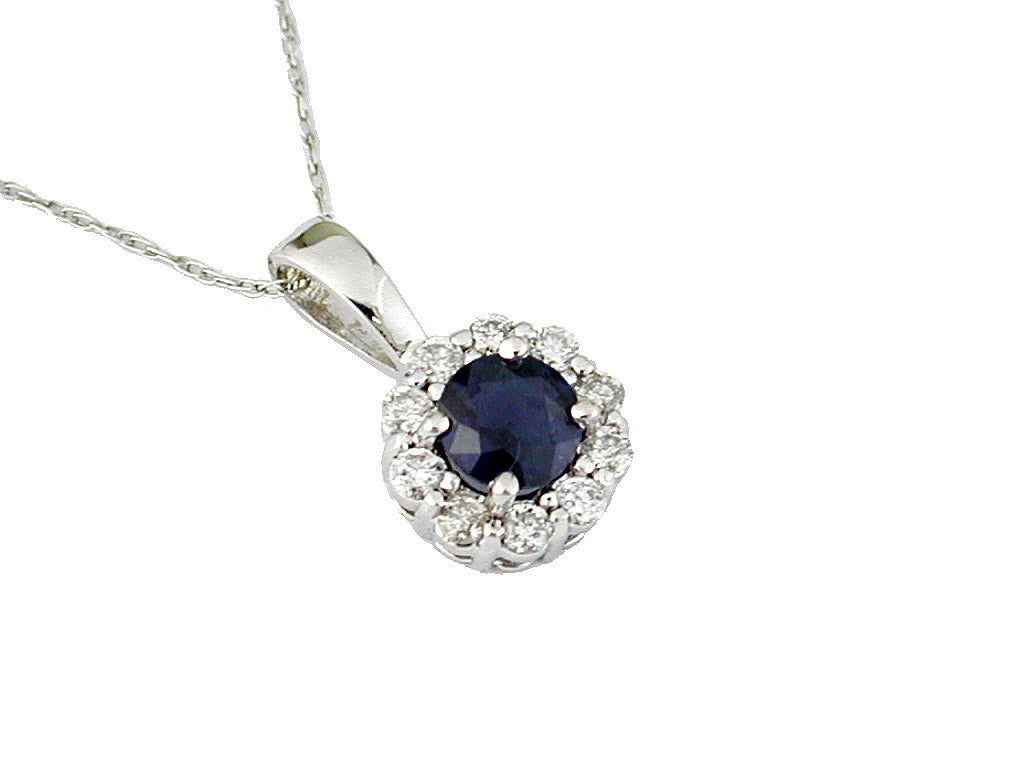 14kw .80ctw Round Sapphire Pendant w/ .30ctw Round Diamond Halo