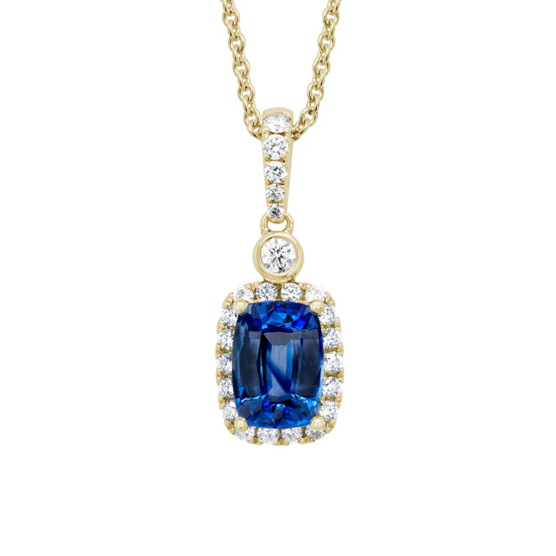 Setting: The stones are set using a combination of prong and bezel settings, with the center sapphire framed by a diamond halo, and additional diamonds decorating the bezel and the bale.