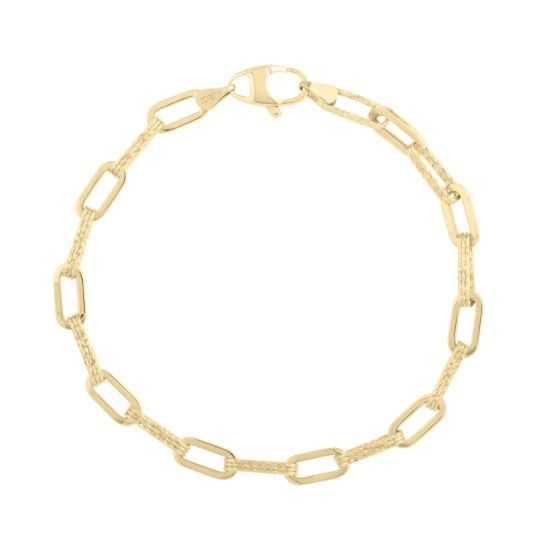 This modern 14kt yellow gold bracelet puts a fresh spin on the classic paperclip chain with alternating polished and textured links. Measuring 7.25 inches long and 4mm wide, the design creates a captivating contrast of smooth shine and intricate detail around the wrist. Securely fastened with a durable lobster claw clasp, this versatile piece is perfect for wearing solo or stacking for a bolder statement.