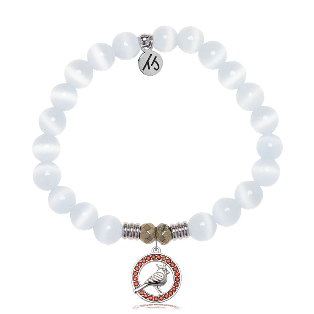 White Cats Eye Gemstone Bracelet with Garnet Cardinal CZ Sterling Silver Charm